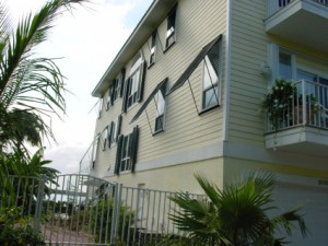 Both shutter systems use fixed louvered panels. The colonial shutters are hinged on the sides and are typically held open by decorative shutter dogs and can be closed and locked when protection is needed. The Bahama shutters are hinged at the top and held open by shutter stays and can be closed and locked for protection as needed. |